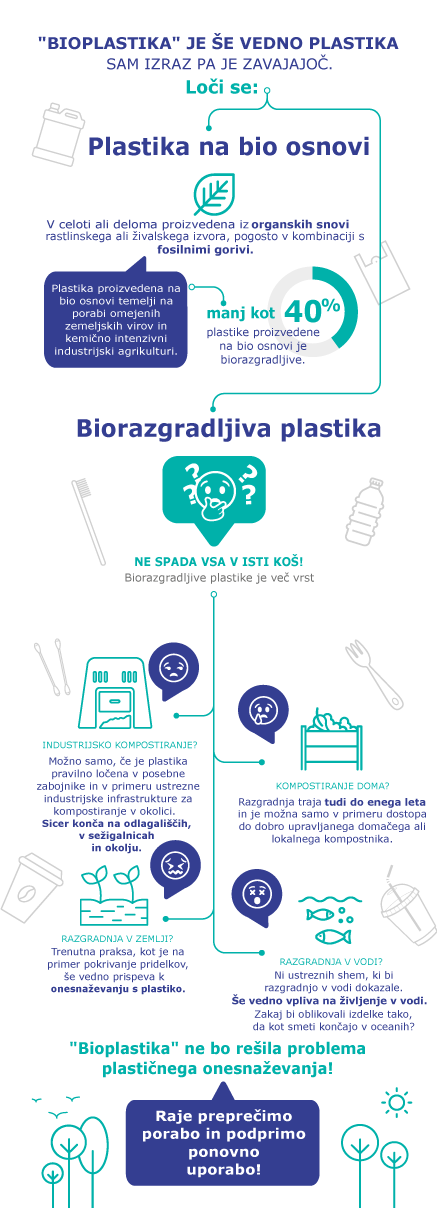Spodnja infografika, ki so jo pripravili pri mreži Break free from plastic, prikazuje razloge, zakaj bioplastika ne bo rešila onesnaževanja s plastiko.